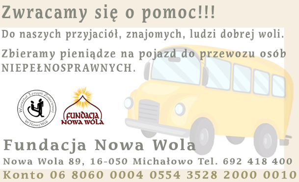 Zarząd Stowarzyszenia "Wierni Tradycji Pokoleń" w ramach akcji charytatywnej "Podajmy pomocną dłoń słabszym i chorym" zwraca się z serdeczną prośbą do wszystkich naszych członków, sympatyków, przyjaciół i ludzi dobrej woli o wsparcie działań podejmowanych przez Fundację Nowa Wola, która zbiera środki na zakup samochodu do przewozu osób niepełnosprawnych.