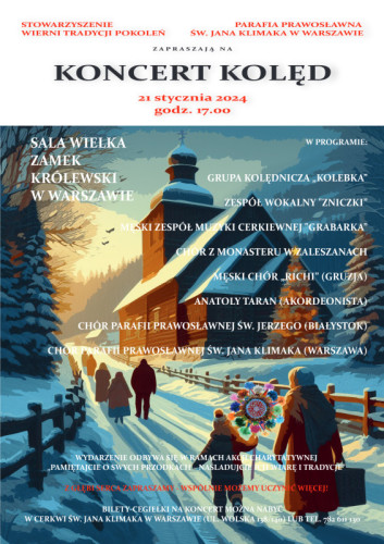 Stowarzyszenie „Wierni Tradycji Pokoleń” i Parafia Prawosławna św. Jana Klimaka zapraszają w niedzielę, 21 stycznia 2024 roku o godz. 17.00 na Koncert Kolęd, który odbędzie się   w Sali Wielkiej Zamku Królewskiego w Warszawie.