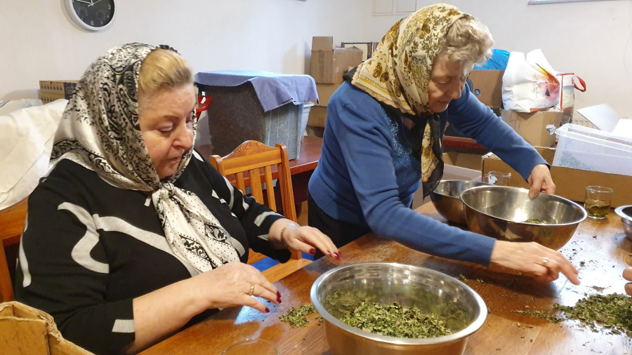 Tworzymy mini zespoły robocze: sprzątamy świątynię, malujemy ławki, które staną przy trawnikach, łupiemy orzechy, skubiemy listki mięty i tymianku, myjemy butelki potrzebne do przetworów. Panowie przerzucają do magazynków worki z opałem, uruchamiają nowy traktorek, skręcają meble ogrodowe.